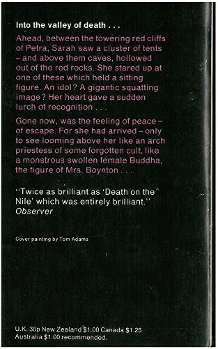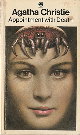 Tom Adams’ second cover, which I think shows a spider crawling out of Ginevra Boynton’s head, is more striking than his first, which shows the ‘monstrous, swollen female Buddha’ of Mrs Boynton amid the red caves of Petra and the cause of her death. But I read the first.