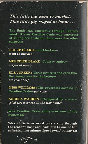 The PAN cover from 1953 shows the five pigs – Elsa Greer, Philip Blake, Meredith Blake, Miss Williams and Angela Warren – lined up in front of the head of Hercule Poirot. It is spoilt slightly by the (incongruous) pair of white spectacles adorning Poirot’s head.