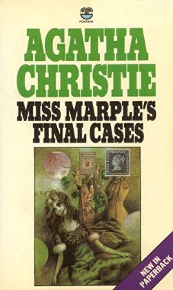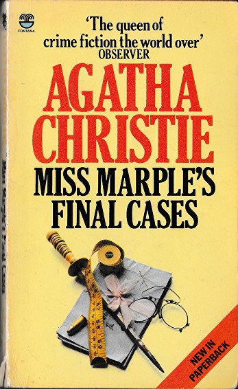 The cover above features some items from the stories – the dressmaker’s tape-measure, some envelopes … The back cover does at least hint that not all of the stories feature Miss Marple (whatever the title might claim).