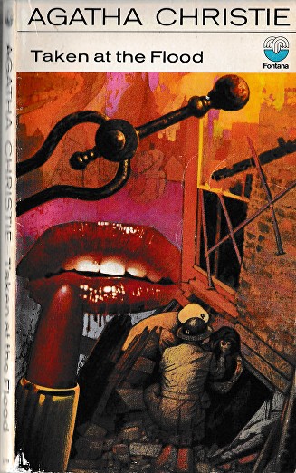 Tom Adam’s cover suggests the background to the story (the Blitz) in the background and two items found in a later death scene (the tongs and lipstick) in the foreground. The earlier Fontana cover is a straightforward depiction of a disguise that is assumed in the story.