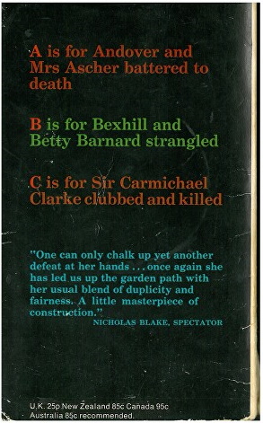 The blurb on the back is perfect (what great alliteration!). The quote underneath it is by the poet-laureate Cecil Day-Lewis, using the pseudonym Nicholas Blake that he adopted when writing crime fiction. He was the father of Daniel, the actor.