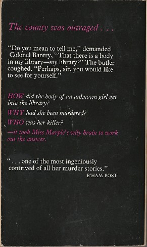 The idea of a dead body being found in the library of a mansion or country house was already as big a cliché in the 1930s as that of the butler being the guilty party. Agatha Christie had been toying with the idea of the library-as-scene-of-the-crime for a while, and settled on making the body’s presence as incongruous as possible.