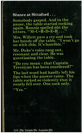 Very entertaining! This is an enjoyable read – a read-in-one-go type of book, in fact. It all seems fairly-clued as long as the readers don’t examine the plot too closely as they race through it. If they stop to think, on the other hand, and discard the voices-from-the-other side theory, they might realise that the murderer would have had to be present at the séance – and only one person left it.